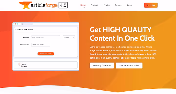 Article Forge génère automatiquement des articles SEO et du contenu multilingue pour une efficacité accrue.